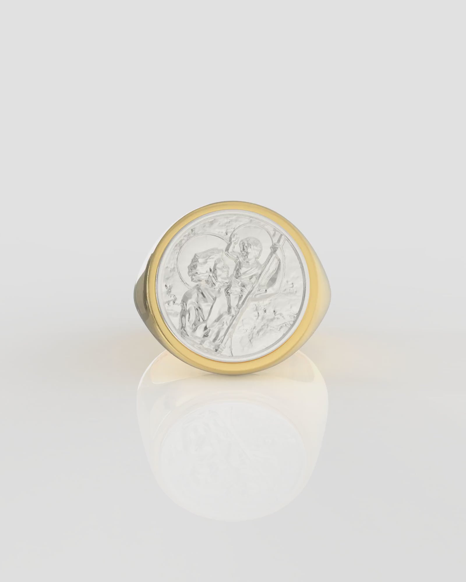 The Saint Christopher Signet Ring, an emblem of protection and faith. Saint Christopher, the beloved patron saint of travellers, embodies safety and guidance. His image of carrying a child across a river represents his role as a guardian and guide on journeys.