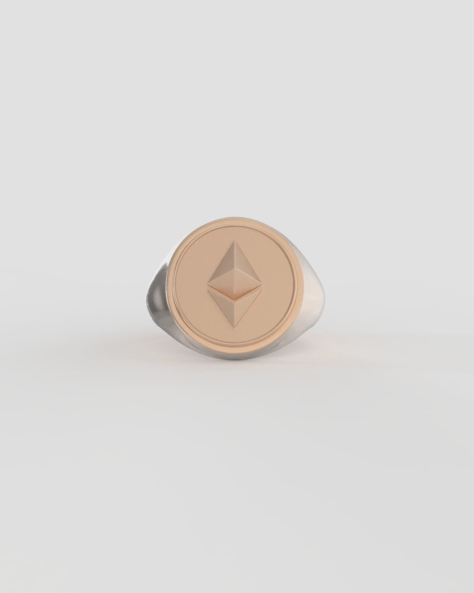 Introducing our Ethereum signet ring, a flawless fusion of modernity and elegance. Meticulously handcrafted with rose gold, this exquisite piece boasts a sleek circular face adorned with the distinctive Ethereum symbol. It represents the transformative power of blockchain technology and the limitless potential of decentralised finance.