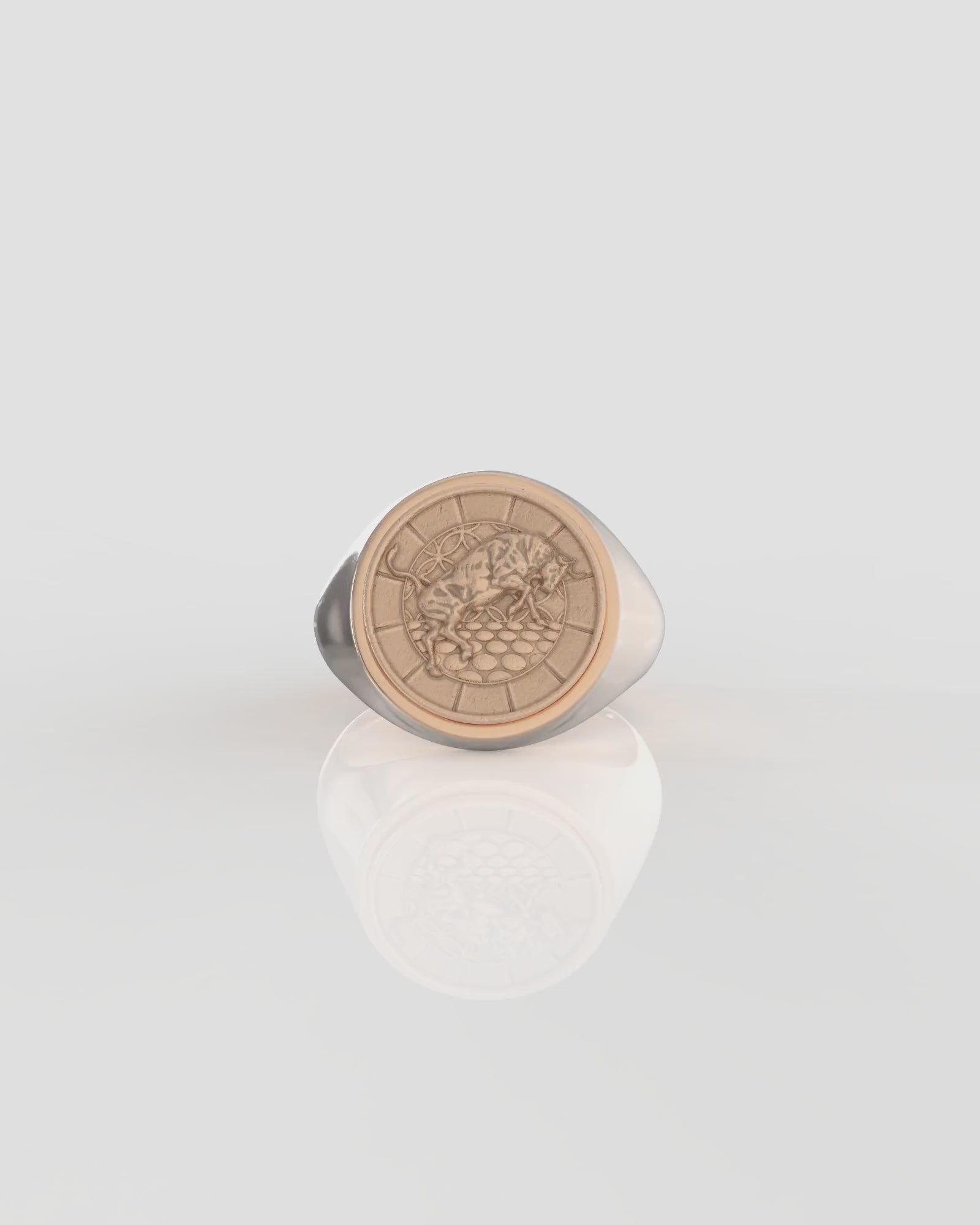 Express your strength and vitality with The Bull Large Signet Ring. Crafted of 9 carat rose gold and 9 carat rose gold insert, this luxurious signet ring is finished with a striking bull design. Boasting a timeless aesthetic never out of fashion, this elegant signet ring will make a luxe statement piece.