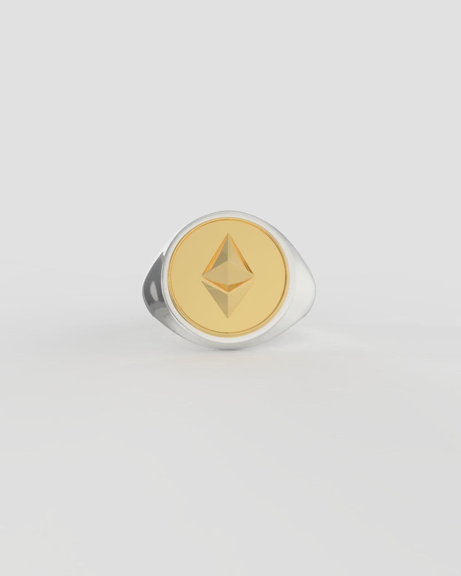 Introducing our Ethereum signet ring, a flawless fusion of modernity and elegance. Meticulously handcrafted with sterling silver and yellow gold, this exquisite piece boasts a sleek circular face adorned with the distinctive Ethereum symbol. It represents the transformative power of blockchain technology and the limitless potential of decentralised finance.