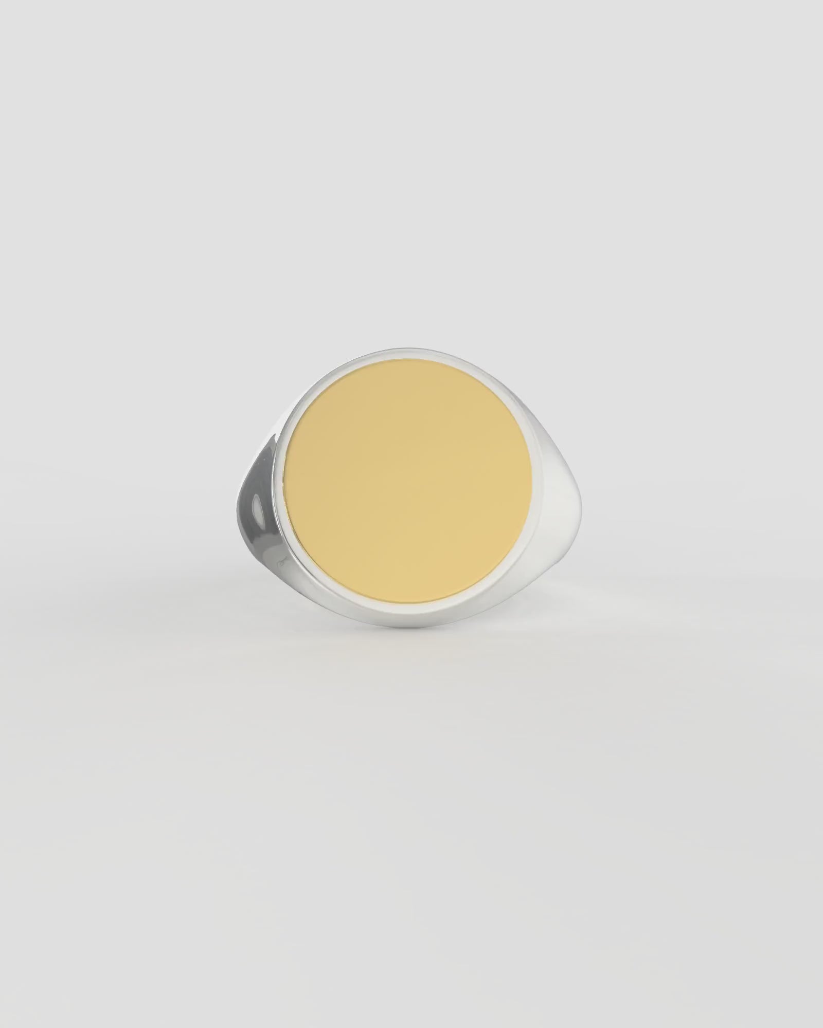 Introducing our large round signet ring, a personalisable accessory that exudes elegance. Crafted from high-quality sterling silver and yellow gold, it boasts a substantial presence on your finger, making it a standout piece for any style or occasion.
