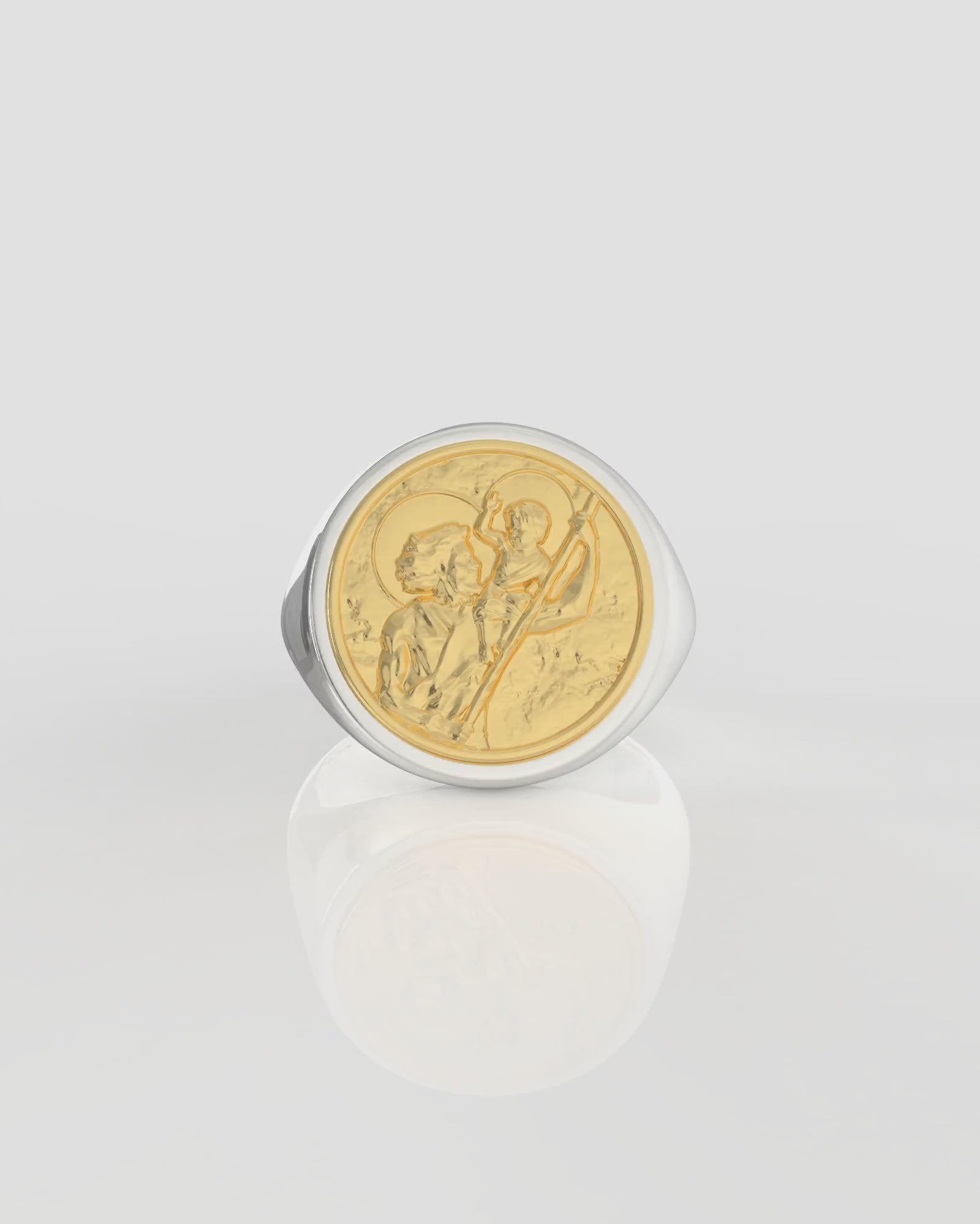 The Saint Christopher Signet Ring, an emblem of protection and faith. Saint Christopher, the beloved patron saint of travellers, embodies safety and guidance. His image of carrying a child across a river represents his role as a guardian and guide on journeys.