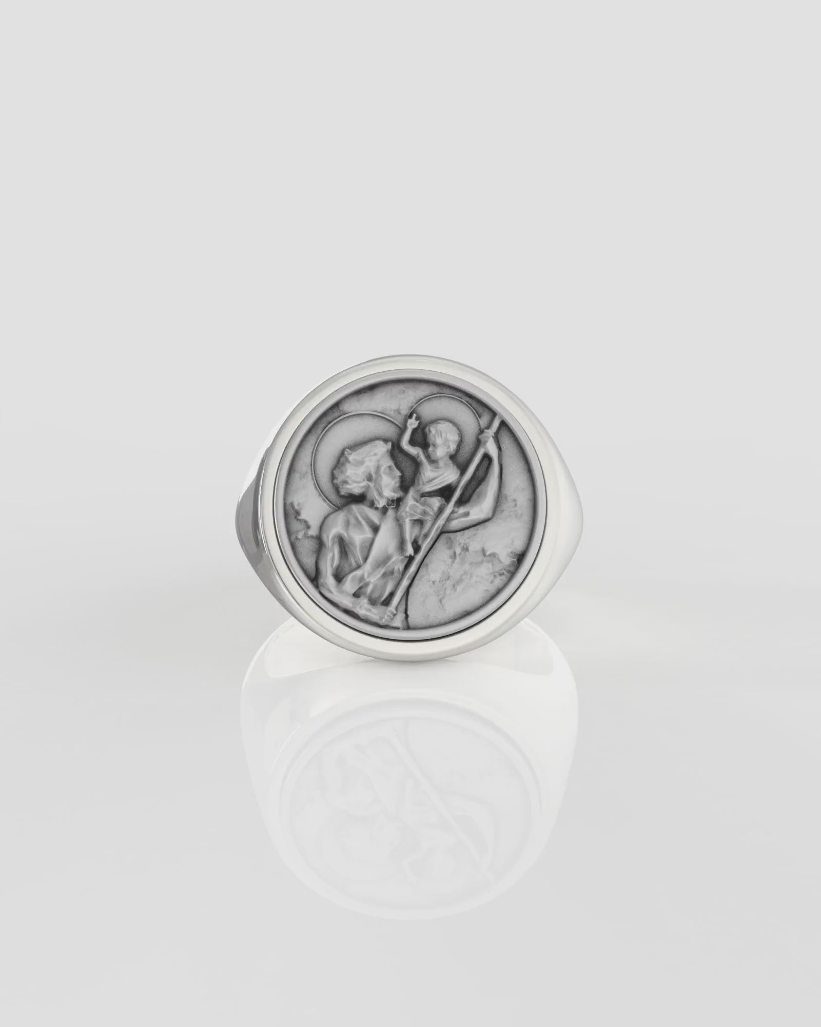 The Saint Christopher Signet Ring, an emblem of protection and faith. Saint Christopher, the beloved patron saint of travellers, embodies safety and guidance. His image of carrying a child across a river represents his role as a guardian and guide on journeys.