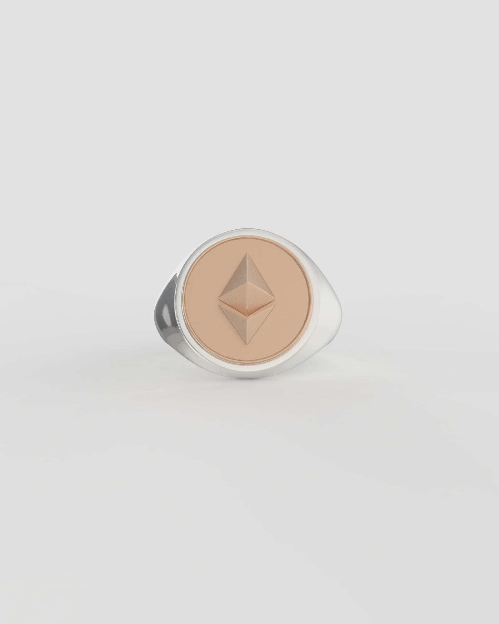 Introducing our Ethereum signet ring, a flawless fusion of modernity and elegance. Meticulously handcrafted with sterling silver and rose gold, this exquisite piece boasts a sleek circular face adorned with the distinctive Ethereum symbol. It represents the transformative power of blockchain technology and the limitless potential of decentralised finance.